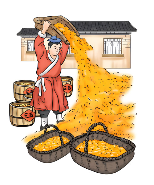 - 漂洗后的芝麻,以鐵鍋碳火慢炒至香味溢出。其中炒芝麻的手法、火候及加料工藝等,都以獨特的秘訣形式由師徒間代代傳承。